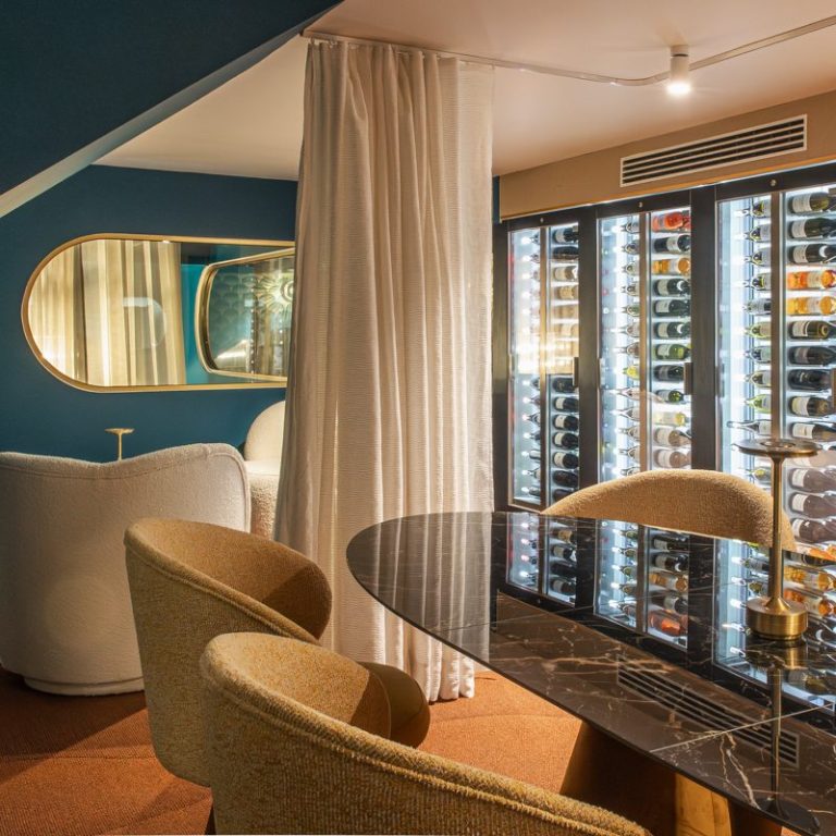 Il est pensé comme un lieu de réception et de partage, idéal pour l’apéritif, mais également entièrement privatisable pour des dîners confidentiels, des réunions, des séminaires ou des dégustations de vins, face à la cave, autour de la table du chef.